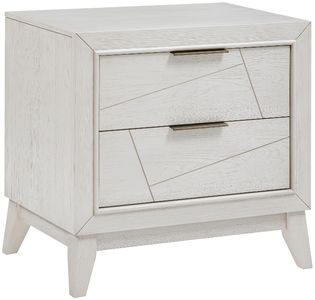 Bold geometrical styling is paired with unfettered modern lines to create the unique design of the Asteria Collection. An antique white finish highlights the collection’s oak veneer. Flat black finished metal bar hardware fronts the drawers of the nightstand. Asymmetrical routing fronts the drawer faces for dramatic accent to the collection.Read More