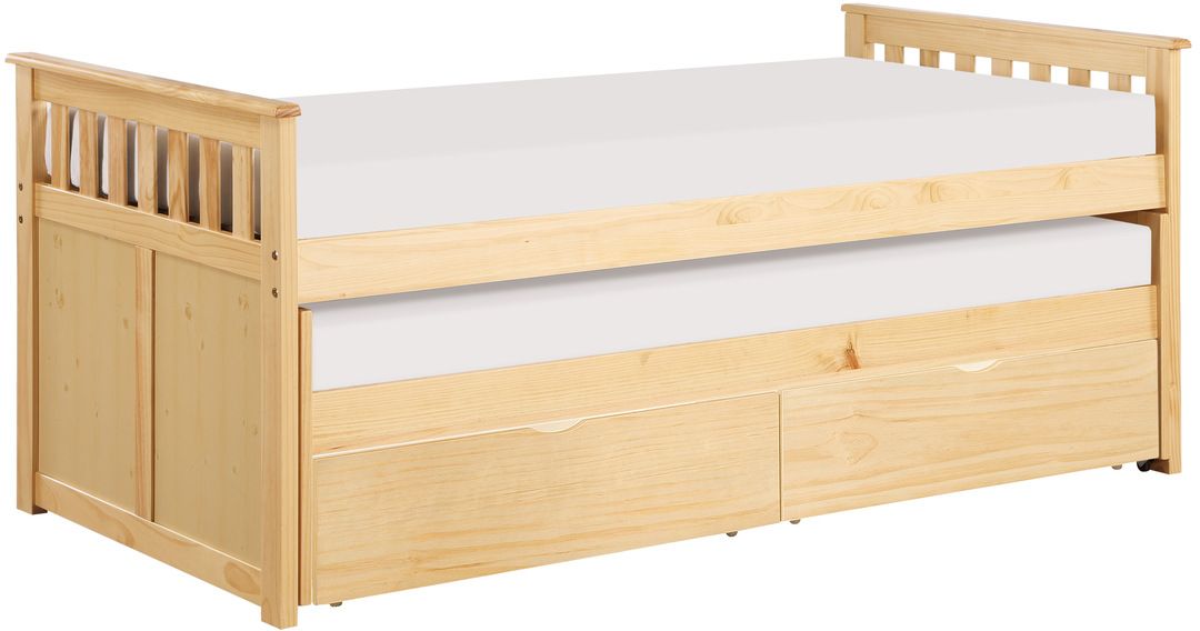 This transitional twin over twin bed is featured in a natural pine finish making it an appropriate choice for a number of youth bedroom settings. The bed’s configuration allows for the addition of dual under-bed toyboxes, allowing for convenient storage underneath the bed.Read More