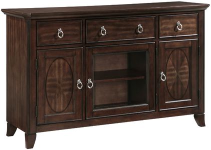 It offers ample storage with three smooth-gliding dovetail drawers, two side cabinets each with an adjustable shelf, and a center cabinet with an adjustable shelf and a stylish glass door. The polished chrome tone ring pulls add a touch of modern sophistication. While assembly is required, the result is a beautifully designed and highly functional server that enhances any room with its classic charm and practical storage solutions.