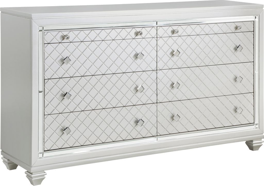The bold visual presentation of the Leesa Collection complements your glamorous design aspirations. Diamond pattern drawer fronts and hardware, and mirrored framing are featured on the silver-finished dresser, it’s classic styling lending timeless accent to the look of the collection.Read More