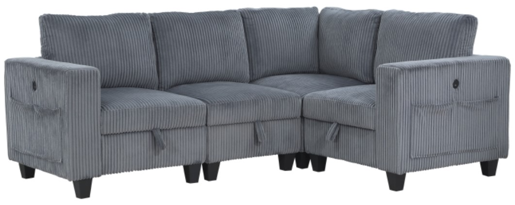 Pull-out storage drawers are neatly tucked beneath the armless chair, and end seats of the sectional, each drawer easily accessible with a pull to the front-mounted loop handle. The corner seating unit of the sectional is anchored by one armless chair while the two end seat’s arms provide side support and power charging ports. The collection is covered in dark gray corduroy fabric for a neutral complement to your home’s décor.