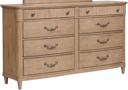 Belgium Wheat–finished double dresser pairs warm pewter hardware with Knotty White Oak veneers, showcasing subtle distressing, fluted legs, tapered feet, and reeded detailing. Its relaxed traditional silhouette offers timeless charm and generous storage, bringing elegance and everyday livability to bedrooms.Read More
