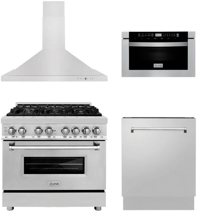 ZLINE 4 Piece Stainless Steel Kitchen Package with freestanding dual fuel range, wall mounted range hood, microwave drawer, and a built in dishwasherRead More