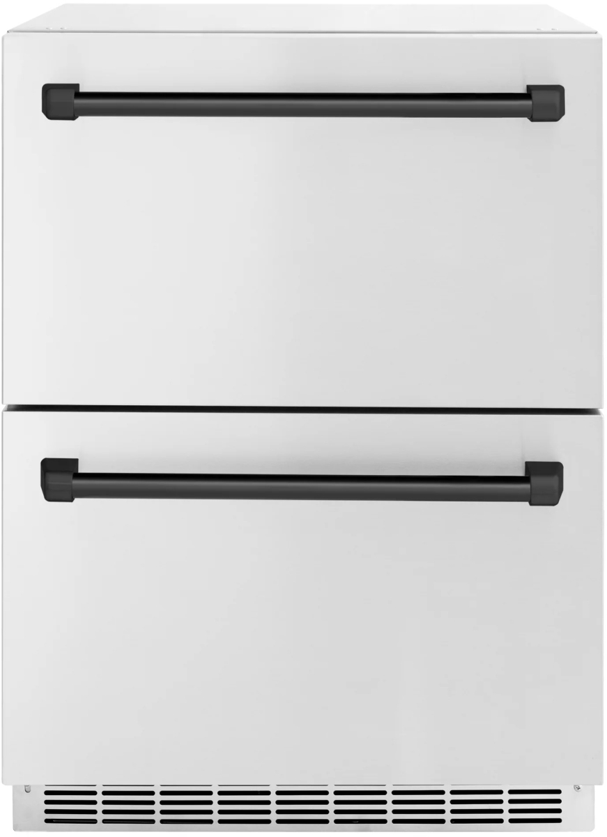 The ZLINE Autograph Edition 24 in. Touchstone 168 Can Outdoor-Rated Dual Refrigerator Drawer with Stainless Steel Doors and Matte Black Handles (RDSOZ-ST-24-MB) features state-of-the-art cooling technology, dual smooth glide soft-closing drawers, and an expansive interior capable of holding multiple beverages.